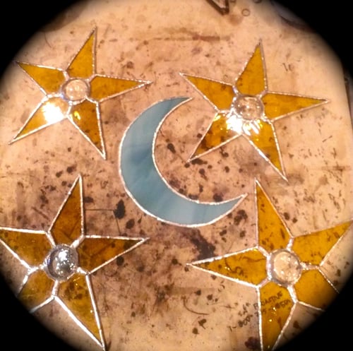 This a beautiful, delicate piece. Crescent moon in cloudy, blue glass; paired with a hanging crystal star. Can also be purchased in a rich cream color. Measures 6 1/2 inches.