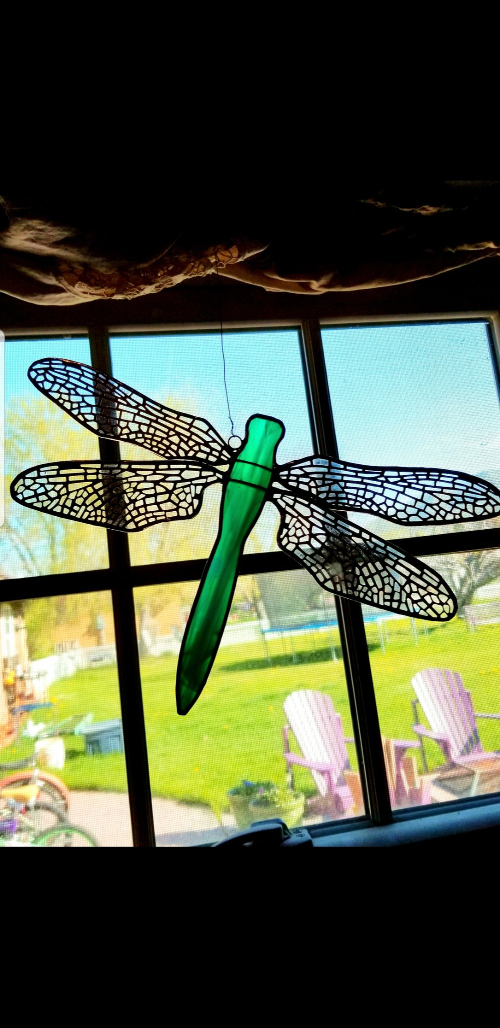 This beautiful dragonfly measures 6 inches tall with a 9 inch wingspan. Wings constructed with delicate brass filigree supported by clear glass. With a glass solid body, finished with silver foiling. This is a truly stunning piece! Other color options please specify.