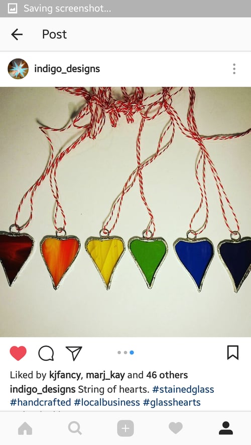 This beautiful collection consists of 5 small hearts suspended on red/white or tan twine. Each heart measures 1 inch by 1 1/2 inches. Can be purchased separately as well. Can be purchased in rainbow colors, please specify.
